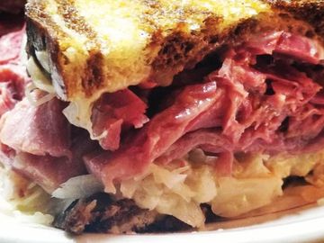 A 1/2 lb. charbroiled burger topped with thinly sliced corned beef, sauerkraut, 1000 island dressing, and melted Swiss cheese on grilled marbled rye.