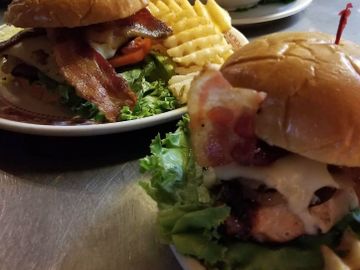 Breaded chicken filet, American cheese, hickory smoked bacon. Served with lettuce and tomato.