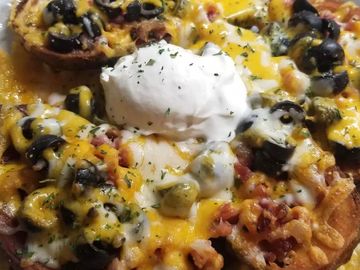 6 potato skins loaded with Cheddar cheese, bacon, and black olives. Topped with sour cream.
