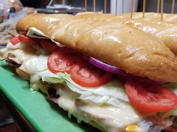 Ham, Turkey, Swiss & American cheeses, bacon, lettuce, tomatoes, onions, and mayo served on a grilled hoagie roll.