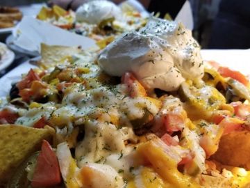 Fresh tortilla chips loaded with cheddar and mozzarella cheeses, diced tomatoes, sliced black olives, jalapenos, onions, and sour cream. Served with our homemade salsa.