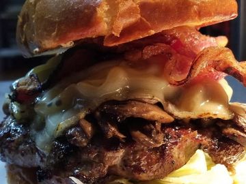 Ages Swiss cheese, smoked bacon, grilled onions and sauteed mushrooms.